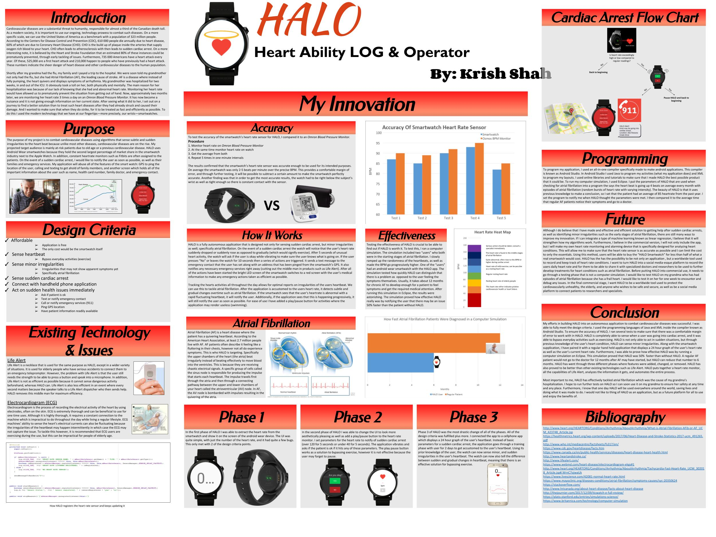 Shortly after my grandma had the flu, my family and I paid a trip to the hospital. We were soon told my grandmother not only had the flu, but she had Atrial Fibrillation (AF), the leading cause of stroke. AF is a disease where instead of fully pumping, the heart quivers and displays symptoms of arrhythmia. My grandmother was hospitalized for two weeks, in and out of the ICU. It obviously took a toll on her, both physically and mentally and I could see that in her. The main reason for her hospitalization was because of our lack of knowledge that she had an abnormal heart rate. Monitoring her heart rate would have allowed us to prematurely prevent the situation from getting out of hand. Constantly monitoring her heart rate and blood pressure became a nuisance and was not giving enough information on her current state. After seeing what it did to her, I set out on a journey to find a better solution than to diagnose such heart diseases before they had already struck and caused their damage. And I wanted to make sure that when they do strike, for it to be treated as fast and efficiently as possible. To do this I used the modern technology that we have at our fingertipsâmore precisely, our wristsâsmartwatches. I grasped the opportunity as soon as I saw it and got straight to work. I developed an application for android wear smartwatches that autonomously detects whether the user is going through cardiac arrest or has a cardiovascular disease, such as atrial fibrillation, where symptoms may not be apparent and immediately takes action on them such as notifying emergency services with the userâs GPS location.